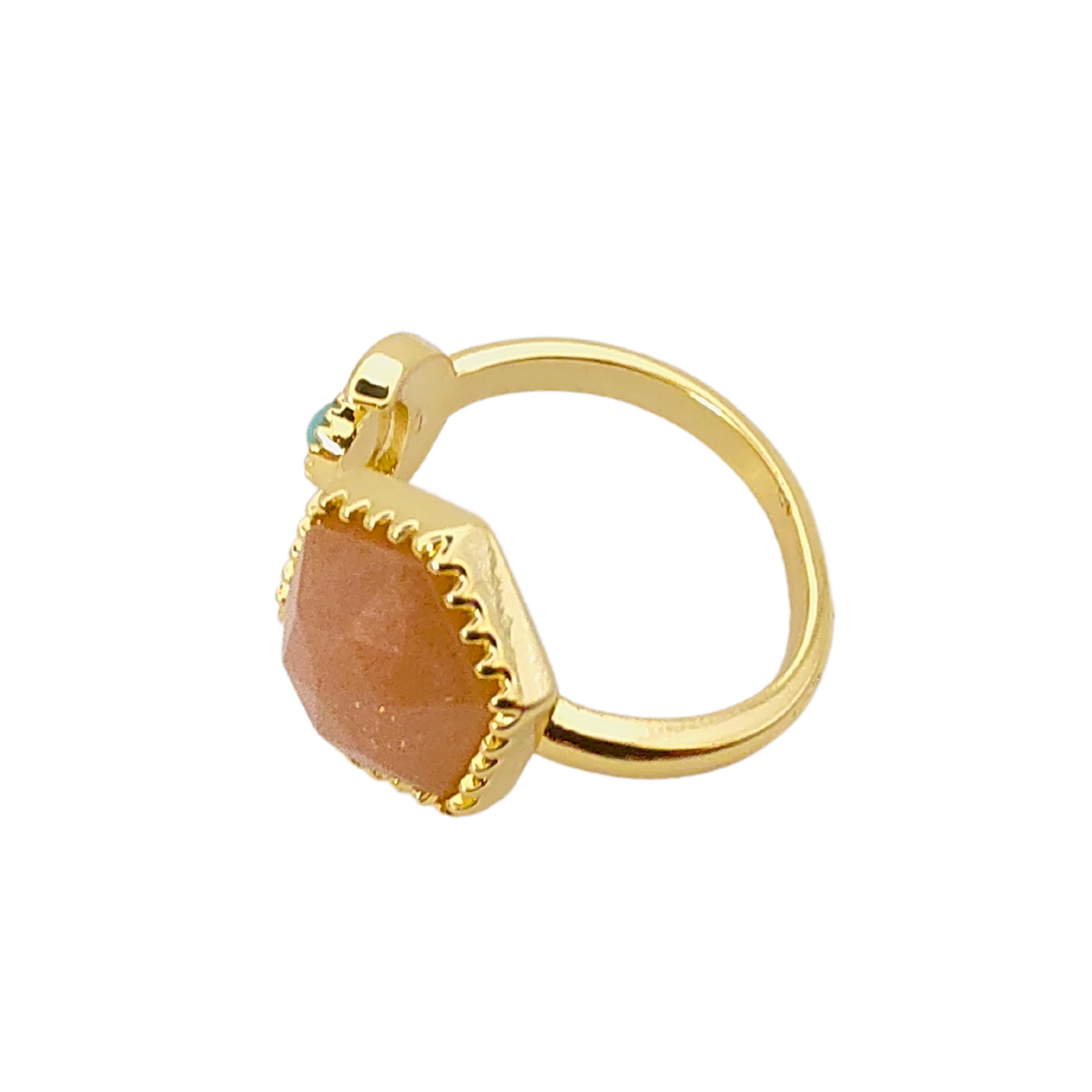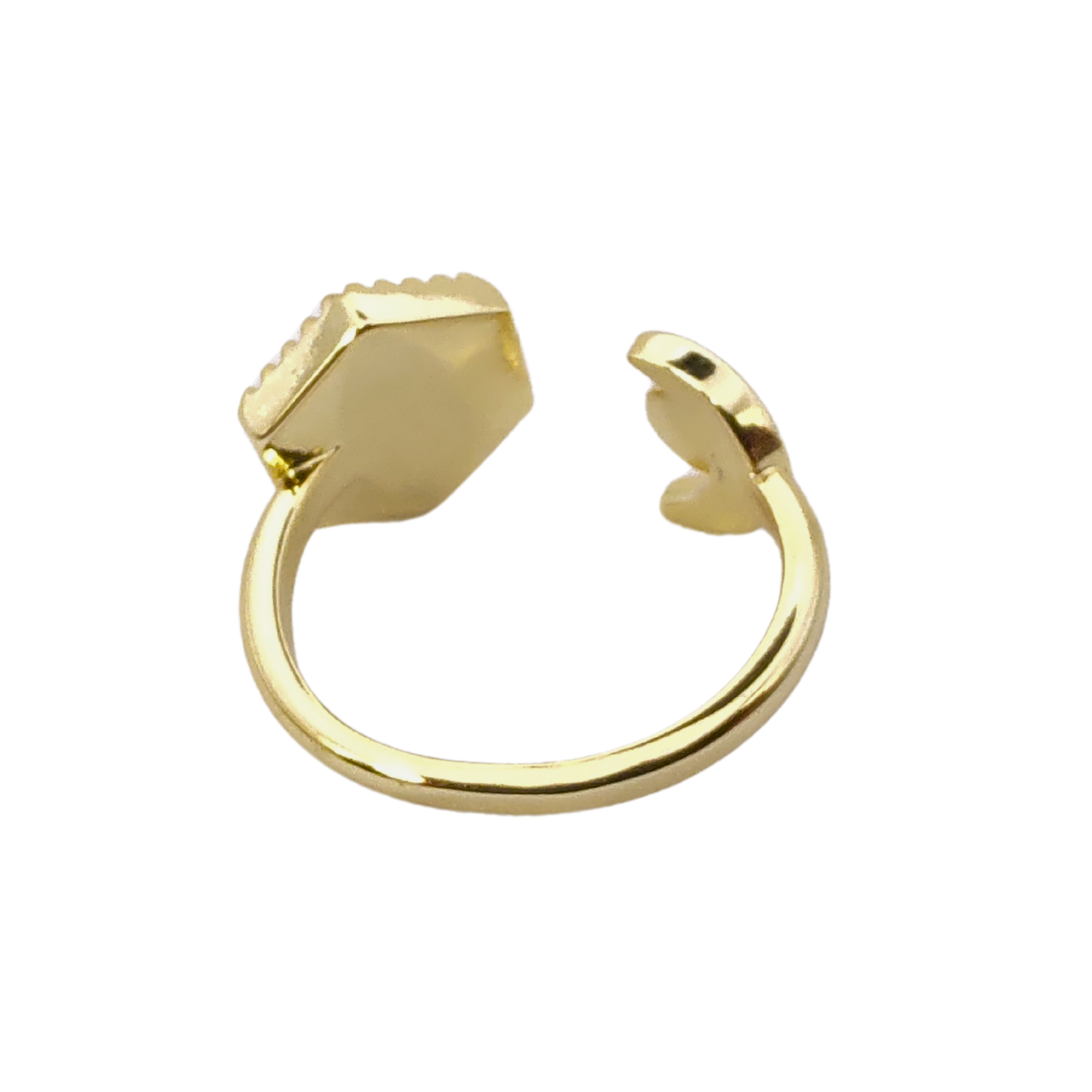 Este anel é uma peça única no mundo da joalheria. Confeccionado em latão e meticulosamente banhado a ouro, este anel não só brilha com um esplendor dourado, mas também oferece a versatilidade de um ajuste perfeito para qualquer tamanho de dedo. Com um peso de apenas 3 gramas e dimensões de 23 mm de largura e comprimento e 26 mm de altura, seu design é tanto confortável quanto marcante.